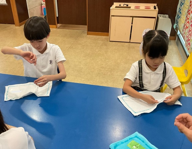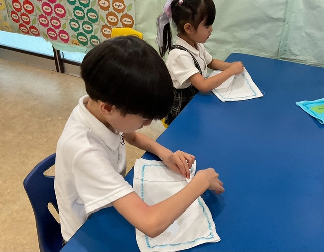 ブログ 年長クラス ぞうきん縫いに挑戦! 年長さんは初めて糸と針を使い、ぞうきん縫いに挑戦しました。 糸を針に通すところから真剣な眼差しで取り組む子どもたち。 一針一針縫い進め、完成したぞうきんを手にした笑顔から大きな成長を感じました
