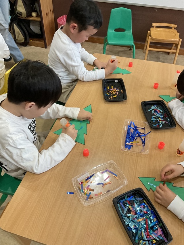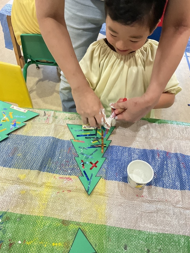 今日はグループアートでクリスマスツリーを作りました。