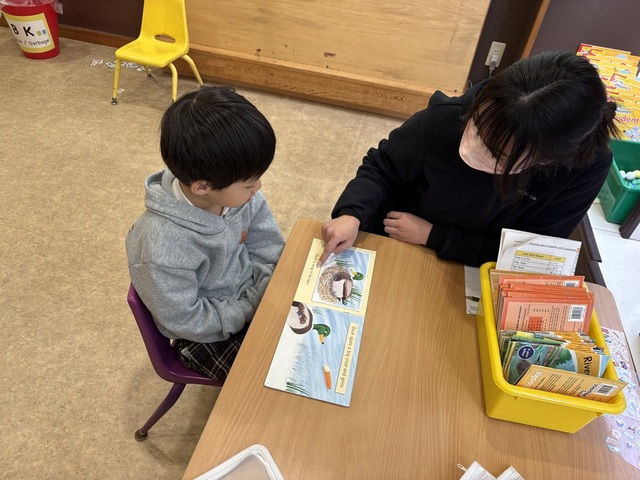 先生が一人一人子供達のReadingをサポートしながら発音チェックなどもしています。